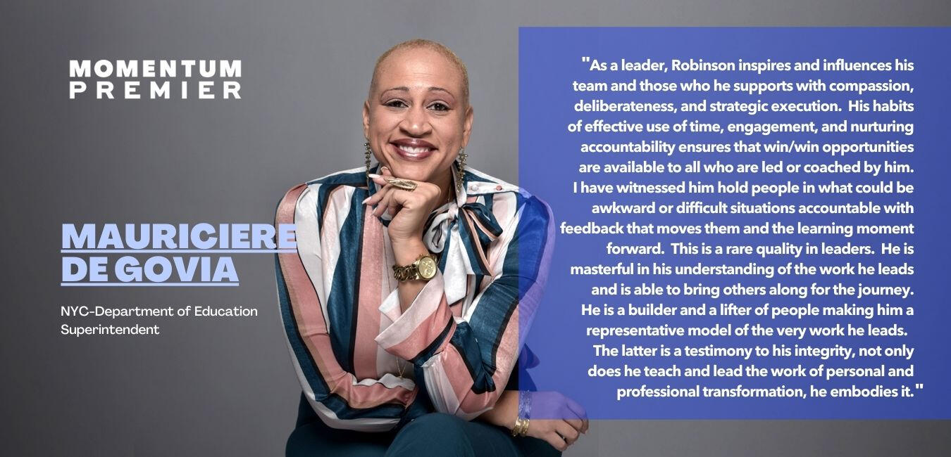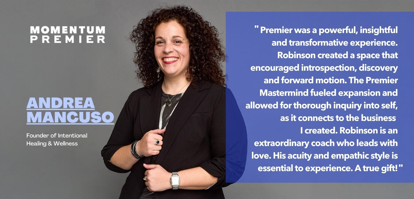 "Working as a soloprenuer can be lonely and challenging on a normal day, let alone during a pandemic. For me, choosing to be a part of Momentum Premier Mastermind was a lifeline that delivered in an abundance of ways. I had been feeling "off-kilter" and disconnected from my business of 14 years when I joined the group. I felt like my team was running me vs. me leading my team. With Robinson's insights, inquiries, and wisdom, I was able to clear what wasn't working, clarify what I wanted and needed, and call forth an aligned support system to help me reignite my vision and next, right steps. I'm forever grateful for Robinson, this experience, and this powerful community."
