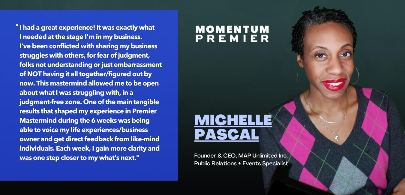 "I was able to accomplish 6 powerful shifts in Premier Mastermind: 1. Acknowledged, found, and named my audience. 2. Discovered the coaching business model that works for me. 3. Developed a transition plan from being an employee to being an entrepreneur. 4. Secured $250K for students to have access to technology to support remote learning. 5. Secured $2K+ in seed money to support my business development and home office creation. 6. Created a relationship with 2 accountability partners that has increased my exposure outside of NYC and concretized next steps in business development and growth."